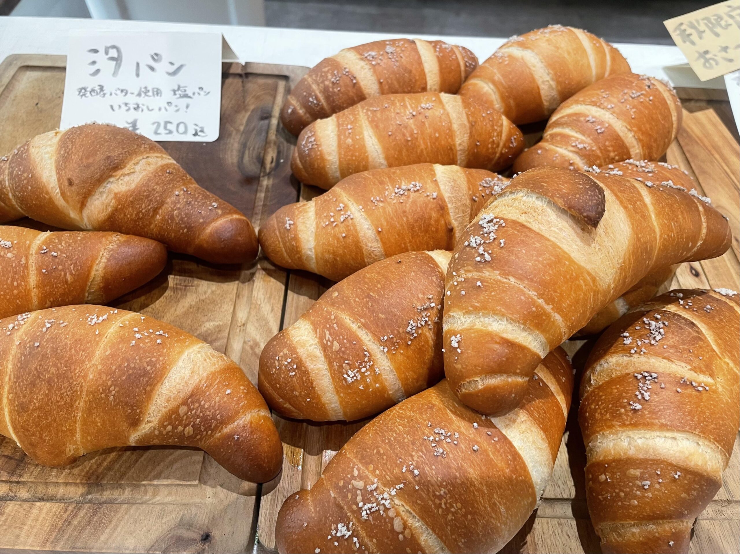 看板商品は、パティシエ時代に習得した【汐パン(塩パン)】。国産の小麦粉とバターを使用し、外はカリッと中はモチッとした食感が特徴で、家族からも評判の一品です。