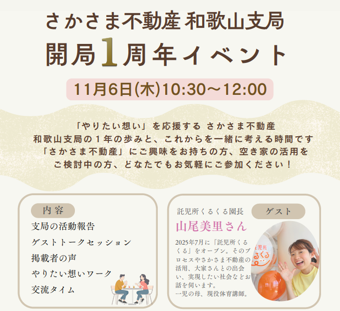 今回のマッチングは、さかさま不動産 和歌山支局の場が奏功したもの。和歌山支局は「小さなお店や取り組み、互助の関係性が生まれることで、心地よい街をつくりたい」という想いのもと、2024年10月に開局。オフィスの一角を開放したり、開業希望者に間借りでスペースを提供するなど、日常的に借主と貸主、地域が自然に関わり合う関係を育んできました。こうした日々の交流が、今回の管理会社と挑戦者のマッチングにつながりました。11月6日には和歌山支局の開局1周年イベント開催。これまでの活動報告や本マッチング事例を地域に共有し、「挑戦を応援し合うまち」への機運を高めます。