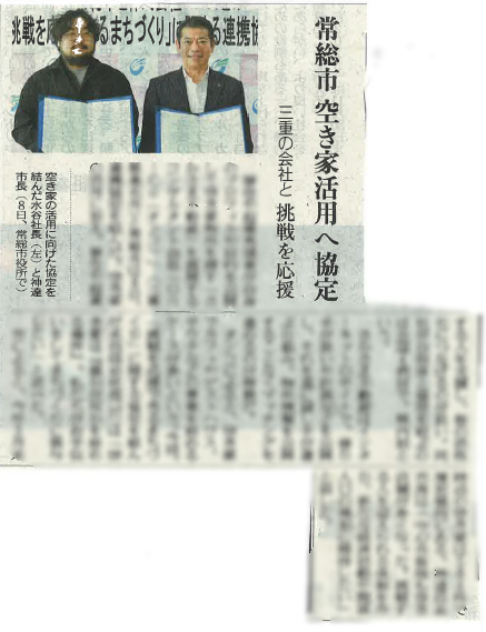 10月10日の読売新聞にて、茨城県常総市と空き家活用や起業支援における連携協定について掲載されました。10月8日には水谷が常総市役所へお伺いし、締結式を実施しました。
