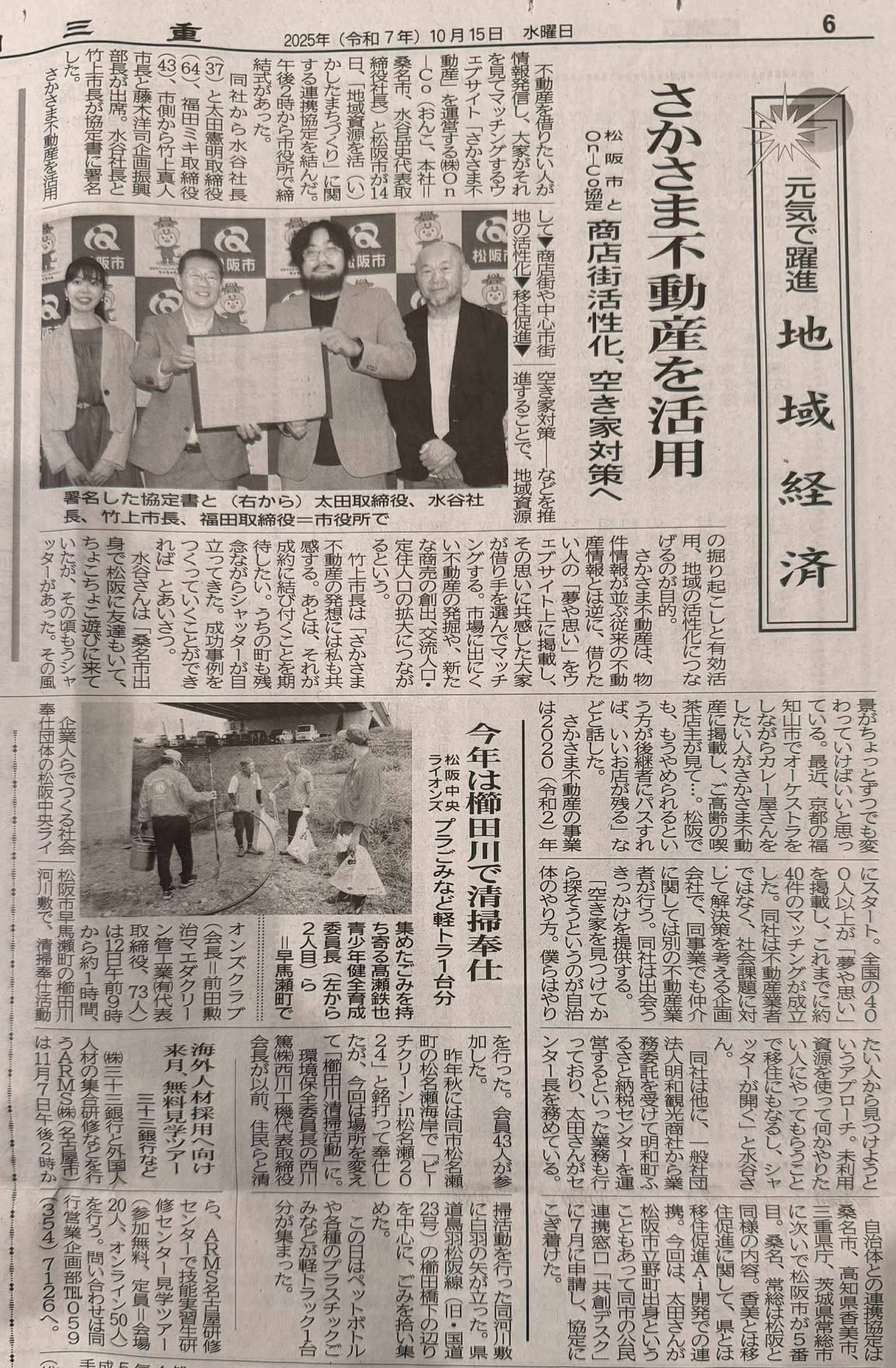 10月15日の夕刊三重にて、さかさま不動産が松阪市と協定締結したことを掲載いただきました。