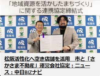 「松阪活性化へ空き店舗を活用 市と「さかさま不動産」運営会社協定」
