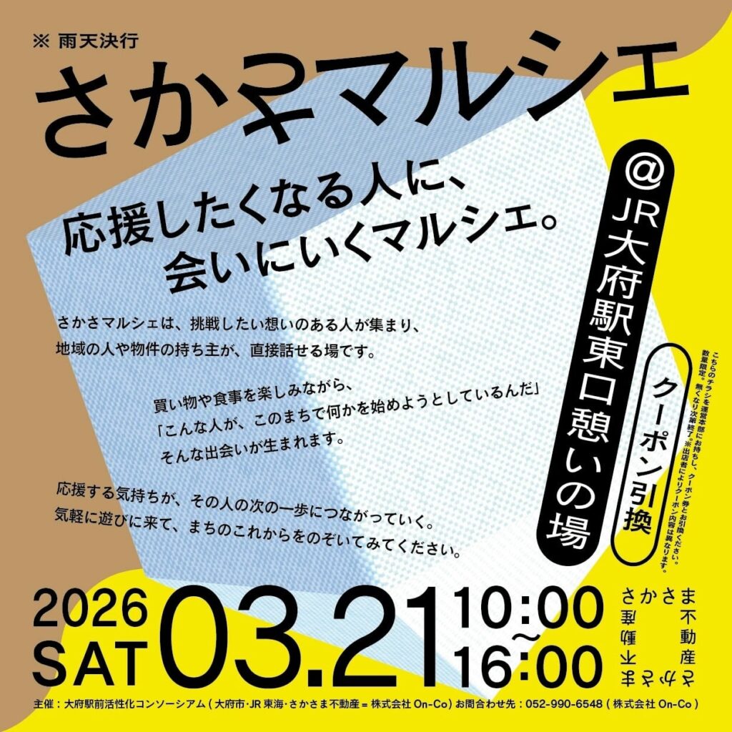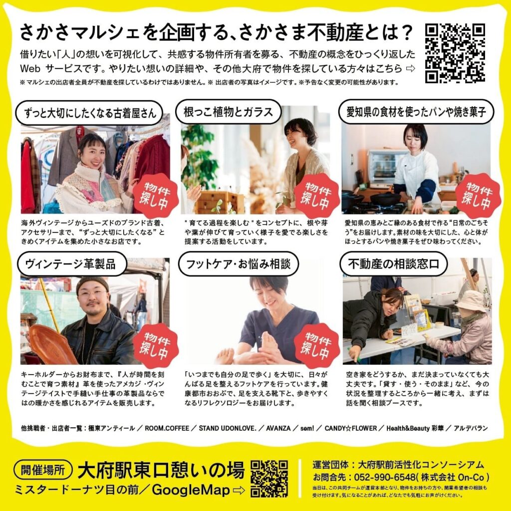 株式会社On-Co(本社:三重県桑名市、代表:水谷岳史、以下On-Co)は、大府市および東海旅客鉄道株式会社(以下、JR東海)と連携し、不動産オーナーと実店舗を探す挑戦者をつなぐ「さかさマルシェ」を、JR大府駅前で継続開催しています。