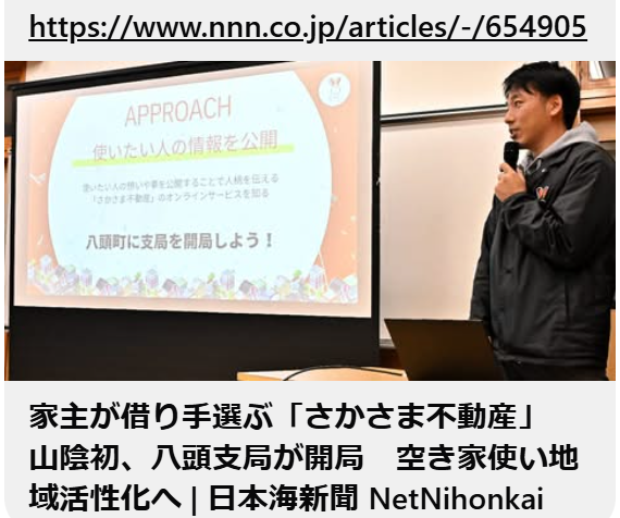 「家主が借り手選ぶ「さかさま不動産 山陰初・八頭支局が開局」の見出しで、日本海新聞に掲載されました.